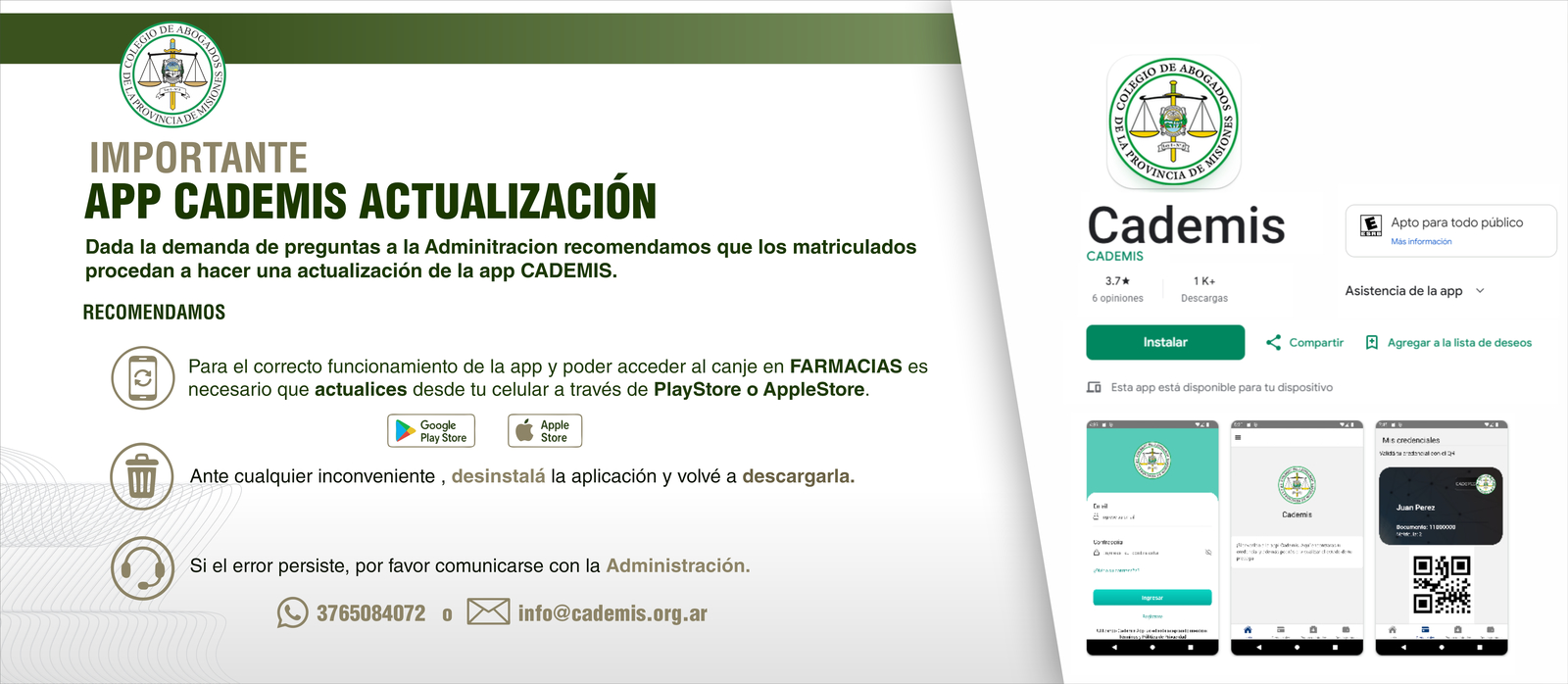 Para acceder correctamente a los Reintegros en farmacias, recuerden mantener actualizada la App CADEMIS desde su tienda de aplicaciones.
