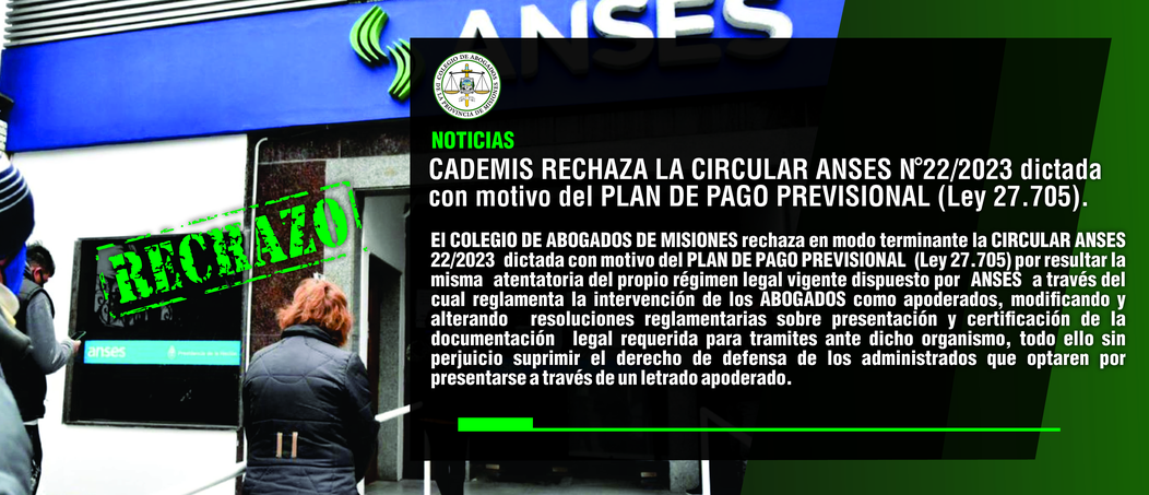 El COLEGIO DE ABOGADOS DE MISIONES rechaza en modo terminante la CIRCULAR ANSES 22/2023 dictada con motivo del PLAN DE PAGO PREVISIONAL (Ley 27.705) por resultar la misma atentatoria del propio régimen legal vigente dispuesto por ANSES por cuanto DESCONOCE la intervención de los ABOGADOS como apoderados, modificando y alterando resoluciones reglamentarias sobre representación ante dicho organismo, como así también normas relativas a la certificación de la documentación legal y formularios requeridos para trámites ante dicho organismo SINO que ADEMAS atenta los derechos de los administrados al limitar su libertad de contar con el asesoramiento letrado pertinente.